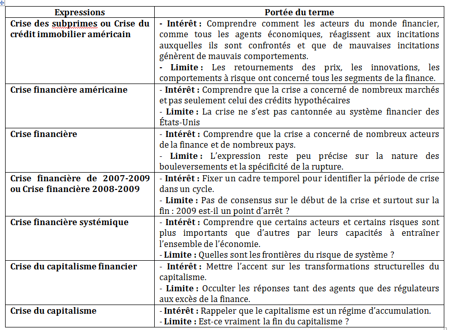 L’expression « crise financière » permet d’englober la crise des subprimes et celle des autres marchés financiers. De plus, elle élargit la portée géographique de la crise et le nombre d’acteurs concernés qui ne se résument pas aux acteurs financiers spécialisés dans les crédits hypothécaires et dérivés.