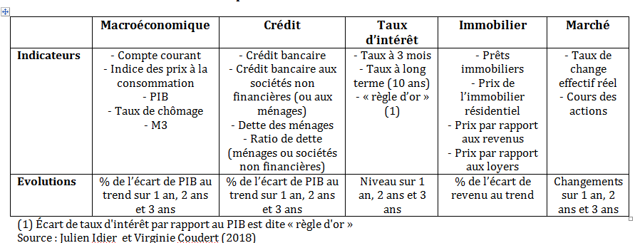 S’appuyant sur les recommandations du Comité de Bâle sur le contrôle bancaire (CBCB) et le Comité européen du risque systémique (CERS), des économistes de la Banque de France montrent alors que ces indicateurs associés au marché de l’immobilier, au crédit bancaire ou à l’endettement du secteur privé non financier sont de bons prédicteurs des crises bancaires en France et dans la zone euro.