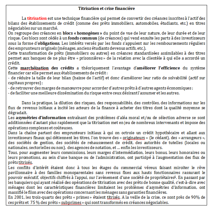 Ensuite, il pointe l’effet d’une généralisation de la titrisation. La titrisation est une opération qui permet aux organismes qui accordent des crédits de se débarrasser d’une partie de leurs prêts pour avoir de la liquidité (ou monnaie) afin d’investir ailleurs. Si la titrisation est positive voire nécessaire, elle peut aussi déresponsabiliser les acteurs. Trop de titrisation tue la titrisation ! En effet, lorsque l’on sait que l’on va se débarrasser du risque que l’on a contracté alors on est incité à avoir des comportements plus risqués, c’est-à-dire à être moins regardant sur la qualité des titres titrisés donc des prêts accordés.