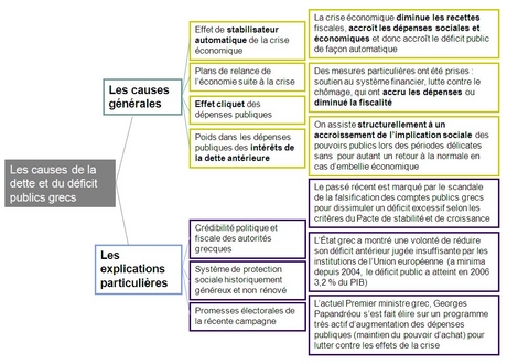 L’endettement public de la Grèce a une cause essentielle : l’accumulation de ses déficits publics, malgré des taux d’intérêt faibles. Si ce pays n’est pas le seul concerné par un niveau de dette publique record – un ensemble de causes générales à ces difficultés peut être identifié – le problème s'y pose avec particulièrement d’acuité, comme le notent régulièrement depuis plusieurs mois agences de notation ou institutions de l’Union Européenne.