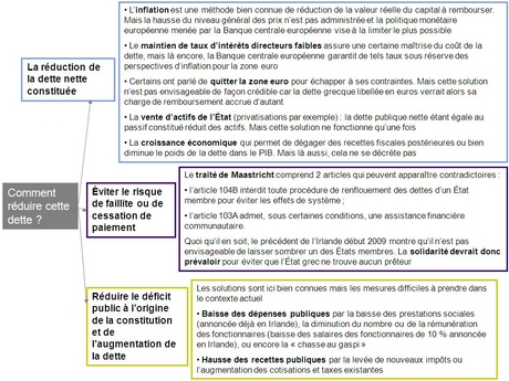Plusieurs leviers d’action sont à envisager, à actionner ensemble : le traitement de la dette publique elle-même, la lutte contre le risque de faillite ou de défaut de paiement de la Grèce, et enfin la réduction du déficit public, à l’origine même de la dette publique.