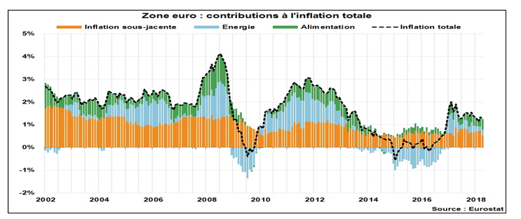 Au sein de la zone euro, le taux d’inflation global est passé de 4% en moyenne à moins de 1.5% en moyenne sur la période 2008-2018. Bien qu’il ait connu des « pics » liés au renchérissement des prix de l’énergie (prix du pétrole notamment), nous observons une baisse tendancielle de l’inflation sur les dix dernières années. L’inflation sous-jacente se situe à un niveau très faible - à moins de 1% depuis 2012 - par rapport à la cible d’inflation fixée à 2% par la BCE.