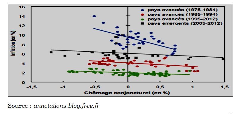 Or, l’examen attentif de la courbe de Phillips sur les dernières décennies montre que la relation chômage/inflation est nettement relâchée puisque sa forme est de plus en plus aplatie.