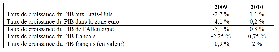 Dans ce contexte, les métaphores alphabétiques pour illustrer différents scenarii de reprise se multiplient : reprise en "V", en "W" ou en "L" ? La première lettre illustre une reprise directe et forte, la seconde n'écarte pas la possibilité d'un double mouvement, une reprise courte suivie d'une nouvelle récession puis d'une nouvelle reprise, et la troisième caractérise une reprise marquée par une faible croissance ou une stagnation. Ainsi, Ben Bernanke, le président de la banque centrale américaine, affirme que les Etats-Unis ont "évité le pire et misé sur une reprise économique à court terme mais celle-ci sera lente à redémarrer". Au Fonds monétaire international, Olivier Blanchard, économiste en chef de l'institution, confirme cette vision en soulignant que la reprise économique a commencé "mais le redressement ne sera pas simple". Le FMI a revu en hausse ses prévisions de croissance pour l'économie mondiale en 2009 et 2010. En Europe, en plus des difficultés de coordination des politiques économiques, la crise dévoile le manque de coordination des prévisions conjoncturelles . Pour Jean-Claude Juncker, Premier ministre du Luxembourg et président de l'Eurogroupe, "il n'y a pas d'indicateur pouvant nous faire penser que la situation serait en train de se redresser dans la bonne direction. La récession que nous traversons est profonde et dépasse en ampleur celle que nous avions vécu au début des années 1990". Pour Joaquin Almunia, le Commissaire européen aux Affaires économiques, "le scénario de reprise graduelle sera reporté à 2010". Jean-Claude Trichet, le Président de la Banque Centrale Européenne (BCE), déclarait en septembre 2009 que "la contraction significative de l'activité économique touche à sa fin et est à présent suivie d'une période de stabilisation et d'une reprise très progressive". La BCE propose maintenant une perspective de croissance pour 2010 alors qu'elle projetait une baisse du PIB quelques semaines auparavant. Plus optimiste, la Commission européenne défend un scénario de reprise économique dans la zone euro dès le troisième trimestre 2009. Cette vision semble partagée par le gouvernement français. Selon le cadrage conjoncturel proposé par le gouvernement aux parlementaires dans le cadre du projet de loi de finance 2010, le PIB français devrait s'établir à 1 970 milliards d'euros, soit une progression de près de 2 %. Compte tenu de l'évolution des prix, le PIB en volume devrait progresser, comme en Allemagne, d'environ 0,8 %. Ces prévisions sont plus optimistes que pour les États-Unis (+ 1,1 %), dont la reprise serait plus affirmée que dans la zone euro (+0,2 %).