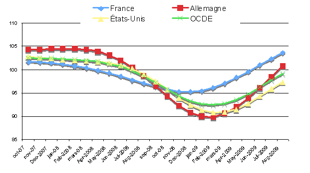 Dès le mois d’août 2009, l'évolution des Indicateurs Composites Avancés de l'OCDE indiquait une reprise de la croissance dans les principales économies industrialisées, notamment la France et l’Italie. Pour la zone euro il est aujourd'hui à 102,0, soit plus de 4 points au-dessus de son niveau observé il y a un an ; il a par ailleurs augmenté à près de 104 points pour la France.