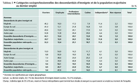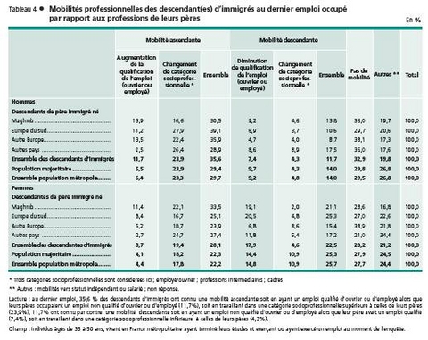Il faut comparer des populations comparables ! Pour ce faire, il est nécessaire de rappeler précisément l’origine sociale (et non pas seulement géographique) des individus interrogés. Or, il apparaît que les enfants descendants d’immigrés sont lestés de trois types de handicaps dans leur progression sociale. Du côté des pères d’une part, les deux-tiers des fils ou filles d’immigrés avaient un père ouvrier à l’âge de 15 ans, soit près de deux fois plus que la population majoritaire ! On note même une surreprésentation des pères ouvriers non qualifiés pour les populations originaires du Maghreb. Or, quelle que soit l’origine géographique des individus, on sait, au travers des différents travaux autour de la mobilité sociale, que l’hérédité sociale demeure des plus élevées parmi les enfants d’ouvriers. Pour rappel, selon la dernière publication des Données sociales en 2006, plus de la moitié des fils d’ouvriers sont eux aussi ouvriers. Du côté des mères à présent, il faut isoler les descendants d’immigrées du Maghreb, plus souvent inactives que les autres femmes européennes : seule une sur trois est active lorsque les enfants avaient 15 ans contre 52 % pour les mères venant d’Italie, d’Espagne ou du Portugal. Là encore, si les mères au foyer peuvent a priori pourvoir davantage aux besoins quotidiens des enfants, des études statistiques ont montré très nettement l’importance de l’emploi et du diplôme de la mère, notamment dans l’aide aux devoirs. Quel que soit le milieu social et le niveau scolaire de l’élève, la mère y passe en moyenne plus du double de temps que le père. Certes les moins qualifiées d’entre elles compensent par une aide plus longue en temps mais elles se sentent plus rapidement dépassées. Cette difficulté apparaît nettement ici puisque 70 % des mères nées en Algérie, au Maroc ou en Tunisie n’ont aucun diplôme. Enfin, la structure familiale joue également son rôle : la taille de la fratrie s’avère plus importante chez les descendants d’immigrés (6,8 enfants pour les mères nées au Maghreb contre 3,9 en Europe du Sud). Dans ce domaine, on peut rappeler qu’un lien de corrélation est établi entre la réussite scolaire et le fait « d’avoir une chambre à soi » : en effet, disposer de sa propre chambre permet de s’isoler et de créer les conditions propices au travail et à la concentration en continuité avec l’atmosphère scolaire mais, plus largement, l’attribution d’une chambre individuelle témoigne d'un fort intérêt des parents pour les études de leurs enfants.
