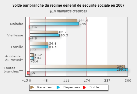 Les deux autres branches, famille et accidents de travail, devraient en revanche être en excédent : respectivement 0,4 et 0,3 milliards d'€ en 2008.