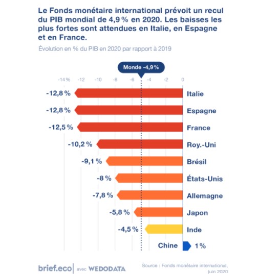 D’après les prévisions établies au mois de juillet 2020 , le Fonds monétaire international s’attend à un recul du PIB mondial de 4,9 % en 2020. Cet organisme chargé de garantir la stabilité financière mondiale estime que la pandémie de Covid-19 a eu « un impact négatif plus important que prévu sur l’activité au cours du premier semestre » et que la reprise « devrait être plus progressive que ce à quoi on s’attendait ». À la mi-avril, il avait évalué ce recul à 3 %.Le FMI prévoit une plus forte contraction du PIB (-8 %) dans le groupe des pays avancés auquel appartiennent l’Italie et l’Espagne, où sont attendues les plus fortes baisses du PIB (-12,8 % chacun). La France est aussi fortement touchée (-12,5 %) comme le Royaume-Uni (-10,2 %). Le FMI s’attend à un recul du PIB plus limité dans les pays émergents et les pays en développement (-3 %) malgré de fortes baisses dans certains pays comme le Brésil (-9,1 %). La Chine est le seul pays dont le PIB est attendu en progression (+1 %).Le FMI explique que les « différences notables » entre les pays dépendent de plusieurs facteurs tels que « l’évolution de la pandémie », « la tendance de la croissance avant la crise » et « la structure économique ». Ainsi, les pays les plus affecatés sont ceux dans lesquels les secteurs le plus gravement touchés par la pandémie, comme le tourisme ou le pétrole, ont un poids important.