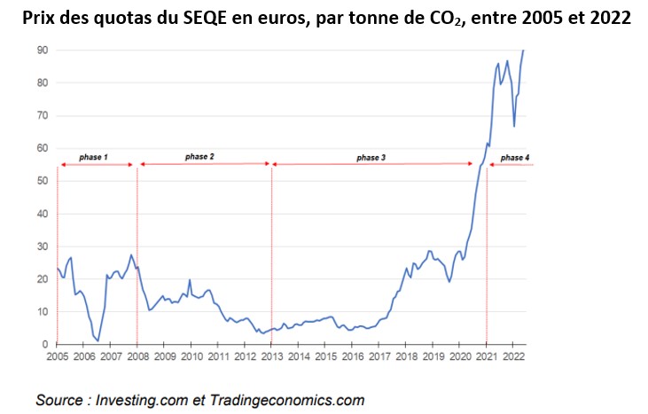 Le graphique permet de repérer l’évolution du prix des quotas d’émission depuis la mise en place du SEQE dans l’UE.