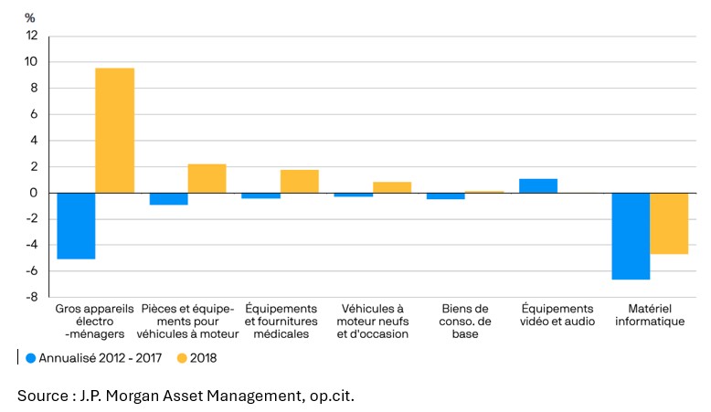 Lors de son premier mandat, Donald Trump avait mis en place des droits de douane ciblés sur certaines importations chinoises en réponse à ce qu’il considérait comme des pratiques commerciales déloyales. Comme le montre le graphique ci-dessous, les secteurs exposés aux droits de douane ont subi une pression à la hausse des prix, mais la portée somme toute restreinte de ces droits de douane a limité la hausse des prix à quelques secteurs, hausse d’ailleurs partiellement compensée par la baisse de prix dans d’autres secteurs (matériel informatique notamment).