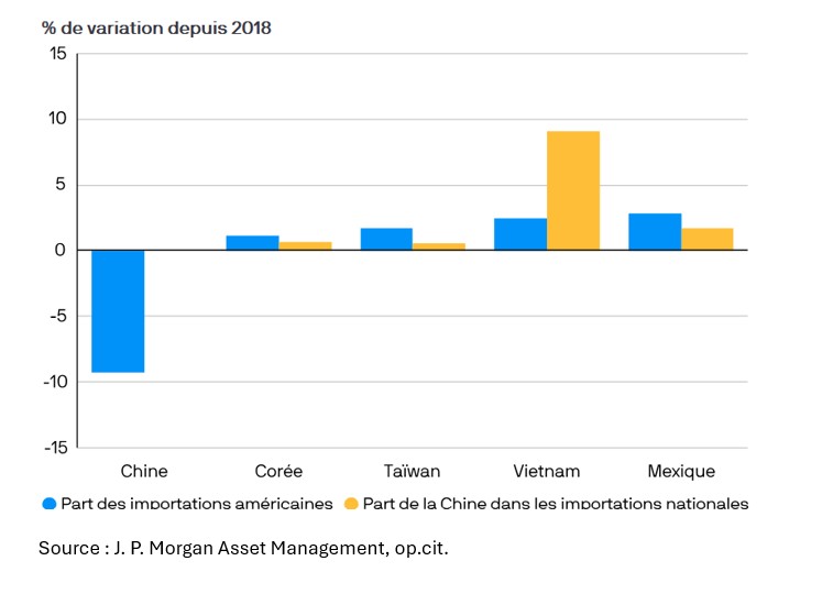 Et une dernière différence porte sur l’évolution des chaines d’approvisionnement. Depuis 2018, la part des importations américaines provenant de la Chine a baissé de 9%, profitant à des pays comme le Mexique, le Vietnam et Taïwan. Toutefois, des données liées aux importations de ces pays suggèrent qu’une partie de cette augmentation du commerce pourrait s’expliquer par le transbordement de marchandises chinoises. La prise de conscience de ce phénomène par l’administration américaine et la portée élargie des pays ciblés par les droits de douane cette fois ci signifient qu’il y a peu de possibilités aujourd’hui que ce transbordement puisse se poursuivre.