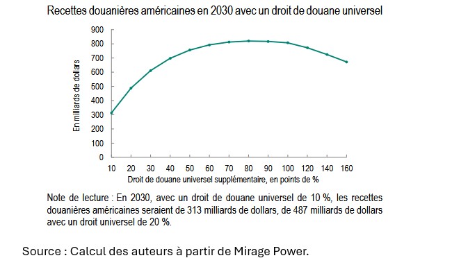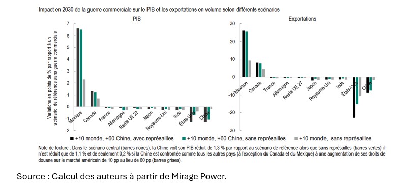 Le CEPII (Centre d’études prospectives et d’informations internationales) a publié en novembre 2024 un article (Antoine Bouët, Leysa Maty Sall, Yu Zheng, « Le prix du protectionnisme de Donald Trump ») dans lequel il évalue, à partir d’un modèle nommé Mirage Power, les conséquences d’une hausse des droits de douane américains sur tous les pays, exceptés le Canada et le Mexique (en supposant que ces deux pays étaient dans une position pour négocier une exemption, ce qui s’avère en début 2025 plus difficile que prévu), et de 60% sur les importations en provenance de la Chine, ainsi que des mesures de représailles à hauteur du préjudice tarifaire de la part des partenaires des Etats-Unis, en reportant ces résultats en 2030, peu après la fin du mandat de Donald Trump. Trois scénarios sont étudiés : un droit de douane universel de 10%, un droit de douane universel de 10% sauf pour la Chine où il serait de 60%, et un dernier scénario dans lequel les droits de douane s’accompagnent de représailles des pays concernés.