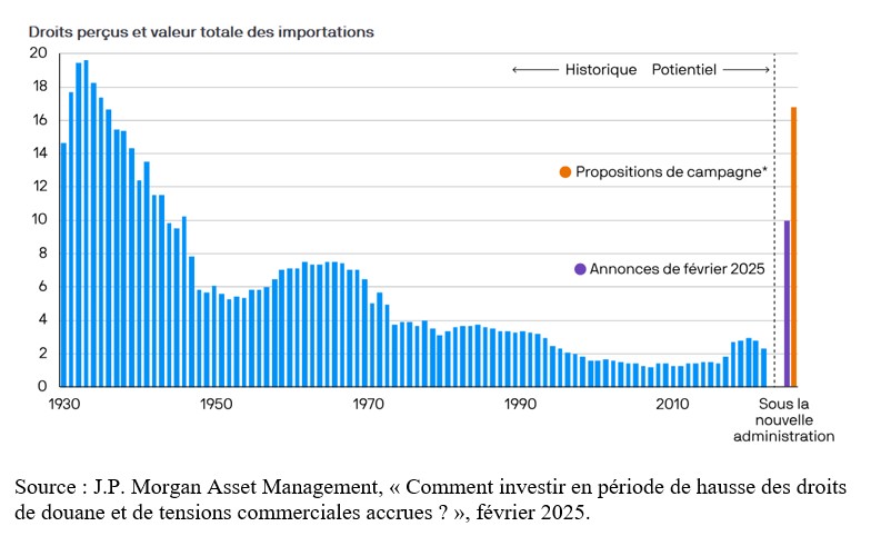 En 2024, Trump a fait campagne en faveur de la création de nouveaux obstacles au commerce international : un droit de douane universel mondial de 10%, un droit de douane de 60% sur toutes les importations en provenance de Chine, et un découplage complet par rapport à Pékin. Les arguments développés en faveur de ces droits de douane se situent dans trois registres : un moyen de rectifier des déséquilibres considérés comme injustes (le déficit de la balance courante est de 818 milliards de dollars en 2023, 920 milliards en 2024), un outil pour générer des revenus destinés à financer des baisses d’impôt nationales (voir plus bas l’évaluation du CEPII), et un instrument de négociation pour imposer les objectifs politiques de l’administration Trump. Aujourd’hui, on constate cependant une incertitude importante sur la composition finale de la politique protectionniste : la première série de droits de douane annoncée début février 2025 visait à appliquer un droit de douane de 25% aux importations canadiennes (hors énergie) et mexicaines, ainsi qu’un droit de douane de 10% à l’énergie canadienne et aux importations chinoises, mais les droits de douane mexicains et canadiens ont fini par être repoussés. Et au 02 avril 2025, le président américain a annoncé un droit de douane de 10% sur toutes les importations, auquel s’ajoutent des surtaxes pour les pays jugés hostiles en matière commerciale (taxes exceptionnelles de 34% pour la Chine, 46% pour le Vietnam, 32% pour Taïwan, 20% pour l’Union européenne. Si la politique prévue au moment de la campagne par le président Trump finissait par être mise en œuvre, le taux effectif des droits de douane sur les importations serait de 17%, alors que les mesures annoncées en février 2025 les situaient à 10% ( contre 2,4% sur la période récente ; voir graphique ci-dessous).