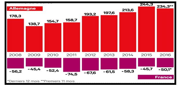 En 2005, la situation des comptes publics allemands était proche de celle de notre pays. Son déficit public était de 3.3% du PIB contre 2.9% pour la France. A partir de 2012, l’Allemagne a conduit une gestion rigoureuse de ses dépenses publiques favorisée par la chute du taux de chômage. Elle a ainsi pu réaliser des excédents budgétaires successifs. En 2016, son excédent budgétaire a atteint 23.7 milliards d’euros.