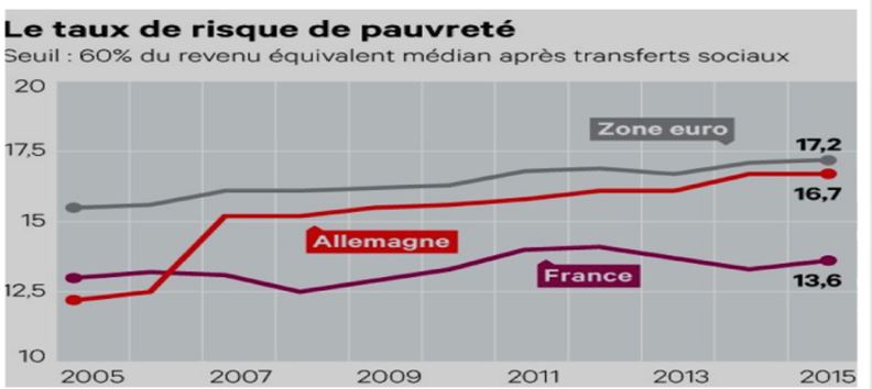 Bien que la croissance économique allemande soit solide et que le taux de chômage soit faible, le Fonds Monétaire International (FMI) a tiré la sonnette d’alarme dans la publication de son rapport annuel au mois de mai 2017 soulignant « une lente augmentation générale du risque de pauvreté » et recommandant aux autorités du pays « une attention continue » sur le risque de pauvreté affectant une partie non négligeable de la population. Ces fragilités de l’économie allemande se sont sans doute exprimées dans les urnes lors des dernières élections législatives avec la progression du parti d’extrême-droite AfD et les difficultés d’instaurer une coalition permettant à Angela Merkel de gouverner.