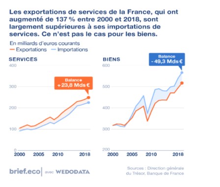 Dans le même temps, les exportations de biens ont progressé de seulement 63 %. De ce fait, les services représentent désormais le tiers des exportations (biens et services) de la France, contre moins d’un quart en 2000. Surtout, la France exporte plus de services qu’elle en importe, ce qui est l’inverse pour les biens. Le solde excédentaire des services compense donc en partie le déficit des échanges de biens.