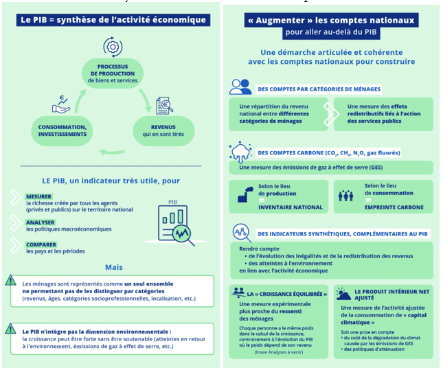 Ainsi, depuis le 5 novembre 2024, l’Insee propose de produire des comptes nationaux dits « augmentés » qui se focalisent sur les émissions de gaz à effet de serre (GES) et les inégalités de revenus entre les ménages. L’objectif est donc de Produire régulièrement de nouveaux comptes associés à la comptabilité nationale (la comptabilité carbone : émissions et empreinte carbone, les comptes nationaux distribués (incorporant ceux du secteur des ménages)).