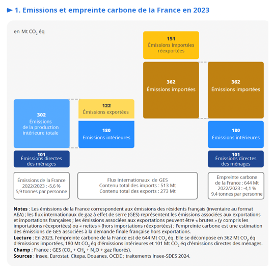 Manuel Baude (SDES), Sylvain Larrieu (Insee), « Émissions de gaz à effet de serre et empreinte carbone de la France en 2023 », Insee première N° 2023, 5 novembre 2024