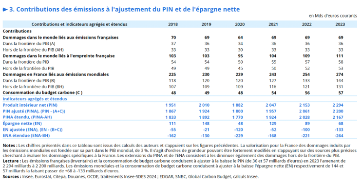 Sylvain Larrieu, Sébastien Roux, « Peut-on prendre en compte le climat dans les comptes nationaux ? L’épargne nette ajustée des effets liés au climat est négative en France » Insee Analyses n°98, novembre 2024