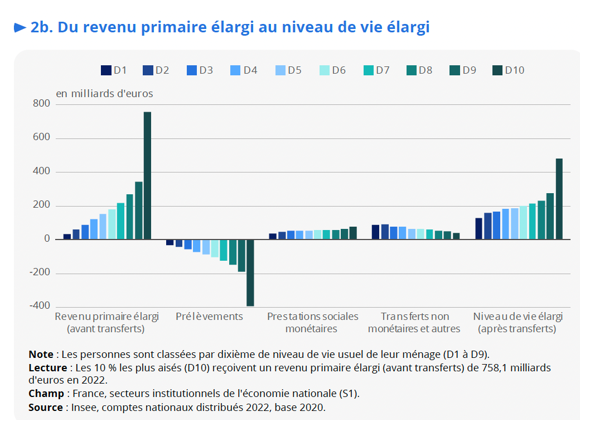 Ainsi, le niveau de vie élargi des 10% les plus aisés après tout mécanisme de redistribution est, 3,8 fois plus élevé que celui des 10% les plus modestes alors que leur revenu primaire élargi est 23,6 fois plus élevé avant transferts. Ainsi, la redistribution élargie divise par 6,3 le ratio des niveaux de vie entre les individus plus aisés et plus modestes. Cf. figure 2b
