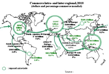 Ainsi, l’ouverture économique est réelle mais sous contrôle. En Europe, conformément au stade atteint dans la classification de Béla BALASSA, cette forme d’intégration régionale se caractérise par un commerce très ouvert pour les pays membres mais essentiellement autocentré : 71 % des échanges extérieurs de l’Union Européenne sont intra-régionaux, ce qui représente environ 27 % du commerce mondial (contre 16.6 % pour Asie du Sud-Est et 6,4 % pour l’Amérique du Nord). Nouveau centre de gravité, la zone asiatique apparaît ensuite comme une source d’opportunités : en pourcentage, elle représente aujourd’hui le double des échanges Europe/Etats-Unis (voir carte).