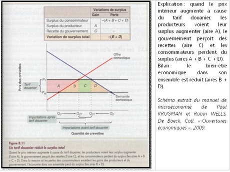 Allant à l’encontre des idées populaires reçues, la doctrine du libre-échange - entendue comme la suppression de toute entrave à la libre circulation des biens et services entre les pays - s’est affirmée comme politique commerciale incontournable en s’appuyant sur plusieurs piliers. En premier lieu, un fondement théorique solide à partir du XIXè siècle : la théorie des avantages comparatifs ricardienne constitue selon le mot de Paul SAMUELSON « la plus belle démonstration économique de tous les temps » en démontrant que des gains à l’échange peuvent être retirés du commerce international y compris de partenaires inégaux, tout en évitant la baisse inéluctable du taux de profit. Dans la même veine, les néo-classiques développeront l’idée que cette politique commerciale limite les rentes de situation en accroissant le degré de concurrence, en stimulant l’innovation et la compétitivité sous toutes ses formes. La protection tarifaire, en concurrence pure et parfaite, provoque certes une hausse du surplus du producteur, apte à maintenir des prix plus élevés sur ses produits, des recettes fiscales supplémentaires pour l’Etat mais les impacts sur le consommateur s’avèrent tels que la différence est négative et se solde par une perte sèche : hausse du prix et baisse de la demande (voir schéma). La théorie montre également que la perte de bien-être peut être supérieure dans les situations de contingentement en raison de l’absence de recettes fiscales.