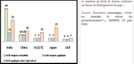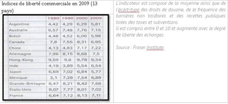 Toutefois, des réajustements, en partie liés à la crise, ont eu lieu au sein des politiques commerciales des grandes puissances. Pour preuve : si l’on se réfère au baromètre du Fraser Institute, l’indice de liberté commerciale a ainsi diminué entre 2000 et 2009 dans la plupart des pays mais en particulier aux Etats-Unis, en Europe (c’est le cas en France, en Grande-Bretagne, en Allemagne) tandis que les pays émergents maintiennent un degré de libéralisation croissant (Chine, Inde).