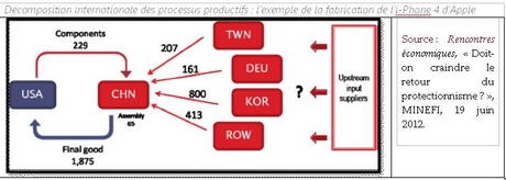 En réalité, comme le note très justement Jean-Marc SIROËN 3 , le niveau de décomposition internationale des processus productifs atteint aujourd’hui par les firmes multinationales rend les mesures de protection traditionnelles peu opérantes : les produits exportés par un pays sont composés de nombreux intrants importés ! Il prend ainsi l’exemple de la fabrication de l’i-Phone 4: assemblé en Chine, ce produit est issu de composants en provenance des Etats-Unis pour 229 millions de dollars et d’autres pays asiatiques pour 1581 millions (voir illustration ci-jointe).