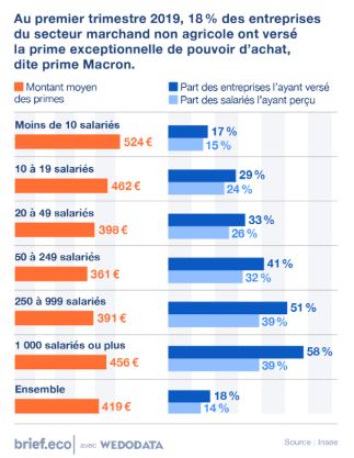 L’étude de l’Insee montre que plus les entreprises emploient de salariés, plus elles ont été nombreuses à verser la prime. C’est ainsi le cas de 58 % des établissements de 1 000 salariés ou plus contre 15 % de ceux de moins de 10 salariés. Ces derniers ont versé un montant de prime supérieur à celui des grandes entreprises : 524 euros contre 456 euros en moyenne.