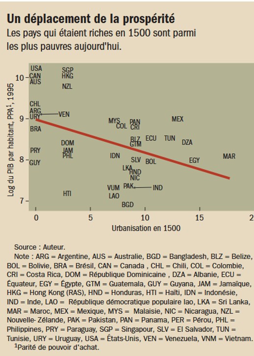 En 1500, les civilisations moghole, en Inde, ou aztèque et inca, en Amérique, étaient parmi les plus riches. Ces sociétés sont aujourd’hui parmi les plus pauvres du monde et, par contraste, nettement moins prospères que celles des pays situés sur les territoires d’anciennes civilisations moins développées en Amérique du Nord, en Nouvelle-Zélande et en Australie. Comme on le voit ci-dessus, il y a une solide relation négative entre l’urbanisation en 1500 et le revenu par habitant actuel : les anciennes colonies européennes qui sont aujourd’hui prospères étaient pauvres avant l’arrivée des colons européens.