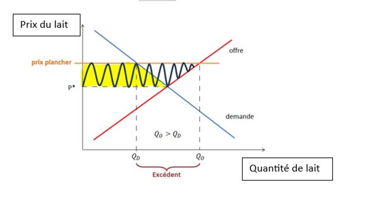 Un prix plancher est un prix minimum en-dessous duquel il n’est pas possible de payer un produit ou un service. Le prix n’est plus fixé par le marché, mais par les pouvoirs publics. Dans la mesure où ces prix planchers sont supérieurs aux prix de marché, ils augmentent la rémunération du producteur, puisque les quantités produites ne diminuent pas ( on voit ainsi apparaître un « surplus du producteur » augmenté, c’est-à-dire sur le graphique ci-dessous le passage de la surface jaune à la surface hachurée).