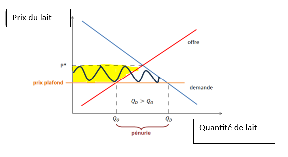 Un dernier problème, et non des moindres, est lié à l’hétérogénéité des coûts de production dans un secteur d’activité donné. Comme ces coûts sont différents selon les exploitations (en fonction de la taille de celles-ci, qui permet des économies d’échelle, mais aussi des conditions de production, comme les sols plus ou moins fertiles…), le prix plancher constitue une « rente » pour les exploitations qui bénéficient des coûts de production plus faibles. Au bout du compte, le prix plancher accentue les disparités de revenus dans la profession agricole. L’hétérogénéité des coûts de production peut aussi avoir une autre conséquence : comme cela a été souligné par bon nombre d’observateurs au moment de la crise agricole, dans un certain nombre de cas, le prix plancher se transforme en prix plafond, qui certes peut dans un premier temps augmenter le surplus du consommateur (voir graphique ci-dessous), mais qui à terme a des conséquences négatives sur l’offre de biens (comme on le voit de manière récurrente sur la pénurie d’offre de logements quand le prix des loyers est encadré). En effet, si le prix plancher devient un point de repère, c’est-à-dire que tous les industriels achètent à ce prix parce-que la réglementation l’exige, cela devient vite assez problématique quand les coûts de production ne sont pas identiques. Par exemple, sur le marché du lait, étant donné que le lait de montagne a des coûts de production supplémentaires, tous les producteurs de lait ne vendent pas leur production au même prix, et il est compliqué de faire admettre à un producteur qui a l’habitude de vendre ses produits à un prix plus élevé qu’il va devoir revenir à un prix plus bas.
