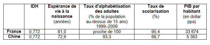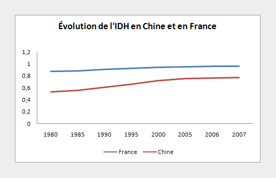 Parmi les nombreuses informations contenues dans ce dernier rapport, deux évolutions attirent l'attention : celle de la France et de la Chine. Malgré leurs différences en termes de développement humain – la Chine appartient aux pays à développement humain moyen (IDH compris entre 0,500 et 0,800) et la France aux pays à développement humain très élevé (IDH supérieur à 0,900) – les deux pays se distinguent par une progression de leur IDH et une montée dans le classement du PNUD.