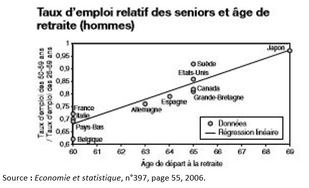 Globalement, on constate sur le graphique ci-dessus que plus l’horizon avant le départ à la retraite est repoussé, plus le taux d’emploi entre 55 et 59 ans est élevé. On peut en effet distinguer deux groupes de pays. Dans le premier groupe (Belgique, France, Italie, Pays-Bas), l’âge de la retraite est relativement bas et le taux d’emploi des seniors est faible. Dans le deuxième groupe (Japon, Canada, Etats-Unis, Grande-Bretagne, Suède), l’âge de la retraite est relativement élevé, et le taux d’emploi des seniors est important.