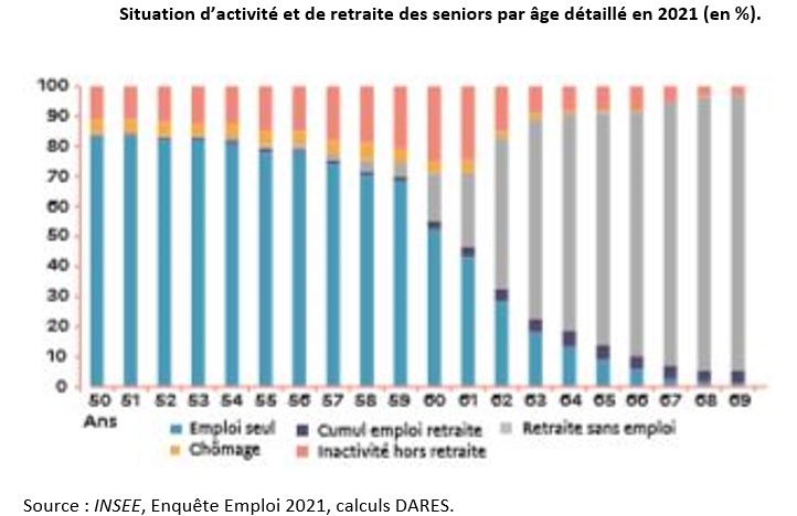 Article : Sonia Makhzoum, « Les seniors sur le marché du travail en 2021. Un taux d’emploi toujours en progression », DARES résultats, 12 janvier 2023, N°2.