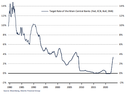 « Pour mémoire, les Banques centrales poursuivent des objectifs multiples. En tout premier lieu, même si ce point est parfois omis par les investisseurs, leur mission est d’assurer la stabilité du système financier. Dans un second temps, elles cherchent à contenir l’inflation proche de 2% par an. Enfin, pour certaines d’entre elles, le troisième objectif est de promouvoir la croissance et l’emploi (et donc l’activité économique). Depuis quelques années, les ratios de dette sont devenus tellement élevés que toute velléité d’accroître les taux d’intérêt fait peser une charge insupportable pour les Etats, les entreprises et les ménages. Les faillites et les défauts de paiement peuvent se multiplier jusqu’à mettre en difficulté les banques et les assurances. En définitive, c’est l’ensemble du système financier qui sera en danger (l’objectif n°1 n’est pas atteint). Une mauvaise nouvelle n’arrivant jamais seule, la croissance ralentira fortement jusqu’à ce que l’économie entre en récession (l’objectif n°3 n’est pas atteint), et que le risque déflationniste ressurgisse (l’objectif n°2 n’est pas atteint). En 1933, quatre ans après la Grande Dépression, l’économiste Irving Fisher avait déjà identifié cette problématique de la déflation par la dette ».