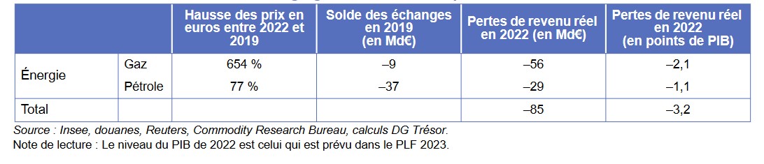 En 2022, la hausse des prix énergétiques et la dépréciation de l’euro impliquent pour la France une détérioration des termes de l’échange. La France étant importatrice nette d’hydrocarbures, la hausse de leur prix relatif entraîne mécaniquement une perte du revenu réel du pays (qui représente le pouvoir d’achat de la nation) qui pourrait atteindre 85 milliards d’euros en 2022, soit environ 3 points de PIB par rapport à 2019 (situation avant la pandémie). Cette estimation ne tient pas compte du comportement des agents. Tout dépend de l’élasticité de la demande de pétrole par rapport au prix : quand le prix augmente, les volumes importés peuvent diminuer, dans une certaine mesure. Par ailleurs, les entreprises peuvent également répercuter la hausse du prix de l’énergie sur leurs exportations, et là aussi c’est une question d’élasticité