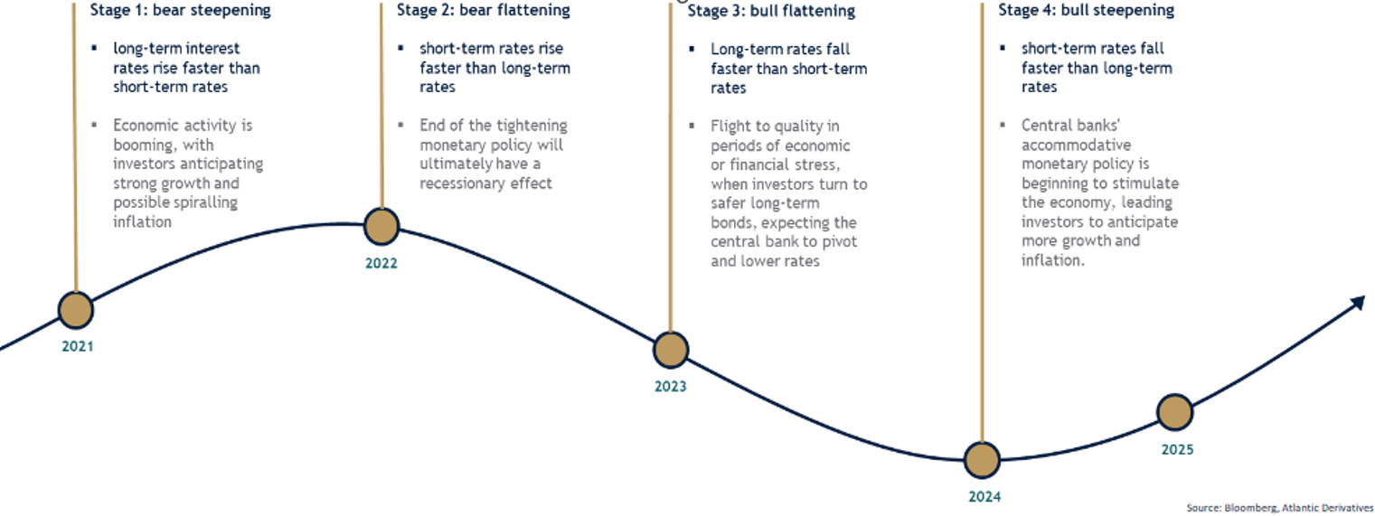 « Cette analyse sur la séquence du mouvement des taux courts et longs permet de converger aisément vers les stratégies de pentification de la courbe des rendements. Chaque phase du cycle économique permet à la courbe de se pentifier, de s’aplatir, voire de d’inverser.
