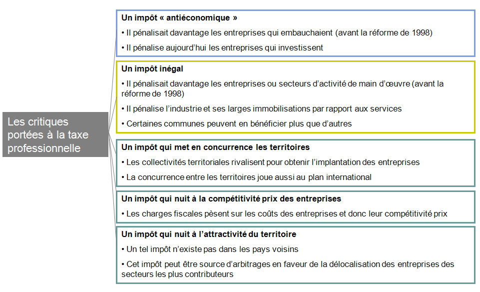 Un certain consensus critique existe depuis de nombreuses années contre cet impôt. Il a abouti à un empilement de dégrèvements complexes, puis, en 1998 à la suppression partielle de la taxe . En effet, le montant à payer était alors croissant avec la masse salariale et les immobilisations des entreprises. Autrement dit, la taxe pénalisait l’embauche et l’investissement . La réforme de 1998, a donc consisté à supprimer la part de l’impôt assise sur la masse salariale, pour ne pas sanctionner les entreprises qui embauchent. Depuis, c’est la part assise sur les immobilisations qui est au centre des critiques.