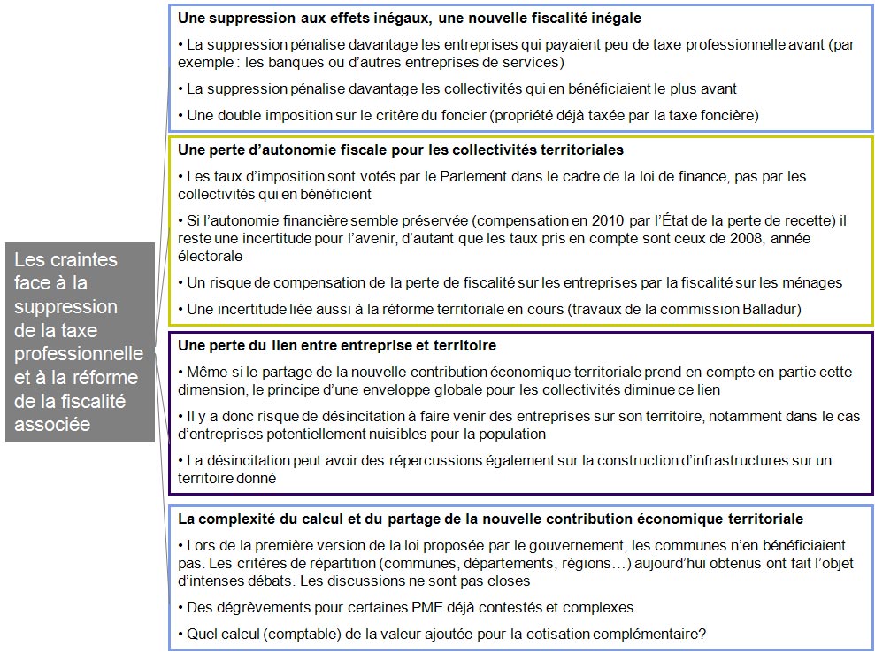 Les élus locaux ont manifesté leurs craintes à plusieurs reprises : elles transcendent les clivages politiques habituels. L’accueil reçu par Brice Hortefeux lors du congrès de l’assemblée des départements de France ou de François Fillon au moment du congrès de l’association des maires de France témoigne de ces tensions. La perte d’autonomie fiscale ou encore la question délicate du partage des fruits de la nouvelle contribution est au centre des débats. Les entreprises elles aussi, dans un contexte de fragilité de la reprise économique ont fait entendre leur voix.