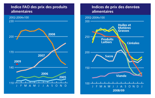 La fin de l'année 2007 et le début de l'année 2008 ont été marqués par de violentes "émeutes de la faim" en Haïti, en Indonésie, aux Philippines, en Egypte, au Maroc au Burkina-Faso, etc. Ces mouvements de révolte populaire, dont certains ont eu des conséquences politiques, ont été déclenchés par la flambée du coût de la nourriture, liée à la hausse vertigineuse, depuis 2006, des cours des grandes matières premières agricoles, en particulier du blé et du riz. La tonne de riz est ainsi passée de 300 $ en avril 2007 à 700 $ en mars 2008. Mais depuis le pic du mois de mars 2008, les cours de la plupart des produits agricoles se sont effondrés, avec des chutes comprises entre 30 et 50 %.