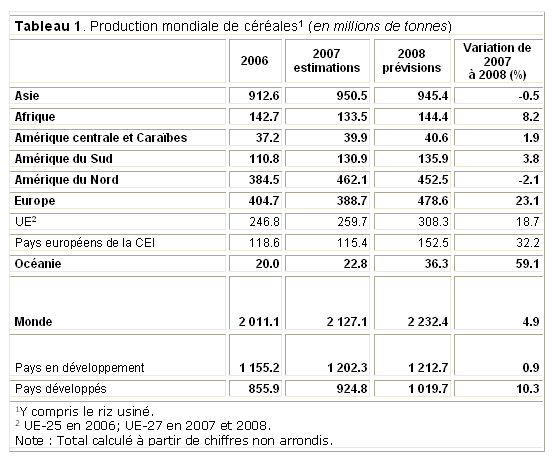 Pour la campagne 2008, la récolte agricole mondiale bat des records historiques. Les prévisions de la FAO concernant la production mondiale de céréales atteignent en effet 2 232 millions de tonnes, en progression de 4,9 % par rapport à 2007.