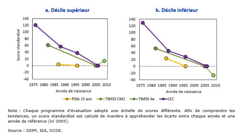 Même Si l’enquête PISA comporte un certain nombre de biais, elle permet d’établir clairement que le niveau des élèves français en mathématiques présente une tendance générale à la baisse depuis 30 ans. Cette dégradation s’illustre par le recul du positionnement de la France vis-à-vis d’autres pays dans les classements internationaux. Le niveau français en mathématiques s’est considérablement réduit par rapport aux pays dont le système éducatif est proche du nôtre, et semble s’être aujourd’hui stabilisé, mais tout en bas du classement. Les pays en tête de ce classement sont systématiquement la Corée du Sud et le Japon. Ces résultats sont conformes à ceux des autres enquêtes disponibles sur le sujet, à savoir TIMSS (« Trends in International Mathematics and Science Study » de l’IEA- International Association for the Evaluation of Educational Achievment), PIAAC (« Programme International pour l’Evaluation des Compétences des Adultes »), CEDRE (« Cycle des Evaluations Disciplinaires Réalisées sur Echantillon » de la DEPP- Direction de l’Evaluation, de la Prospective et de la Performance ), et LEC (« Lire, Ecrire, Compter » de la DEPP également. A titre d’illustration, on observe que la France, encore en tête de classement pour l’enquête TIMSS qui concernait les élèves de 4ème nés en 1982, est passée au dernier rang dans l’enquête TIMSS Relative aux élèves de CM1 nés en 2009.
