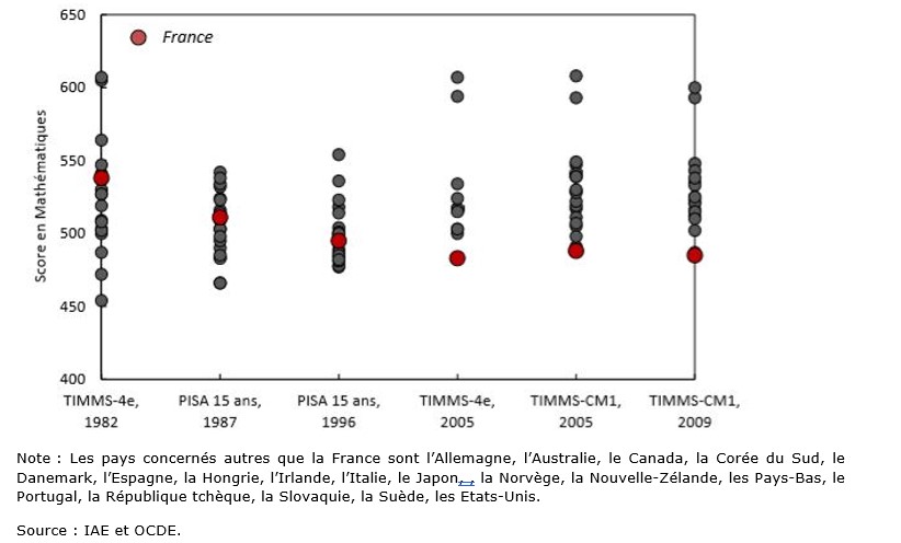 Le niveau des Français en mathématiques ne cesse de se dégrader depuis 30 ans. La France fait maintenant partie des pays de l’OCDE dont le niveau en mathématiques est le plus faible. Cette baisse de niveau pose un problème économique d’importance car les différents travaux économétriques font état d’un lien négatif entre le niveau de compétences en mathématiques et la productivité du travail.