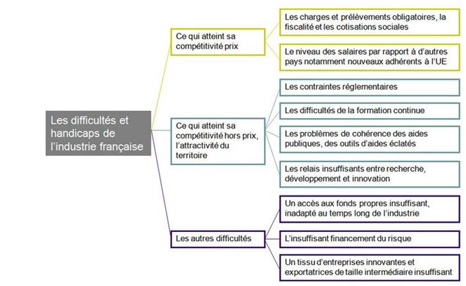 Du point de vue de la compétivité-prix, le coût salarial est en général plus élevé en France que dans bon nombre de pays appartenant à l’Union européenne, ceci s’expliquant par les salaires parfois plus élevés, mais surtout par les cotisations sociales, la fiscalité et les charges diverses qui pèsent sur les entreprises. Du point de vue de la compétitivité hors-prix, les difficultés sont très diverses, provenant à la fois du secteur bancaire (financement insuffisant du risque d’entreprise, mauvaise orientation de l’épargne,…), de la puissance publique (contraintes réglementaires élevées, formations initiale et continue insuffisantes ou mal adaptées, aides publiques mal ciblées,..) ou d’une innovation défaillante, du fait de financements trop faibles ou de relais insuffisants entre la recherche fondamentale et le développement de produits nouveaux. Tout cela fait que l’appareil productif français est mal positionné, pris entre la double concurrence des pays émergents sur les produits traditionnels et des pays développés sur les produits à haute valeur ajoutée.