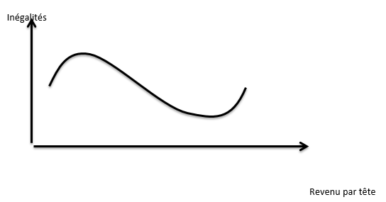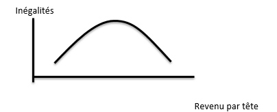 Si les inégalités sont acceptables dans la mesure où elles sont nécessaires à la croissance, elles le sont d’autant plus si la croissance tend naturellement à les diminuer à plus long terme. Autrement dit, les inégalités peuvent être justifiées si elle favorisent une croissance économique qui elle même réduit les inégalités à long terme. C’est l’idée que défend Kuznets dans un article de 1955, intitulé « Economic growth and income inequality ». En utilisant des données provenant de différents pays développés, il montre qu’au début de leur industrialisation, les inégalités ont eu tendance à augmenter du fait de la concentration du capital entre les mains des plus fortunés. Toutefois, au bout d’un certain temps, les revenus des plus défavorisés ont augmentés, provoquant une baisse des inégalités. Dans son article, Kuznets fait de ce constat une loi générale. Autrement dit, il y aurait une hausse suivie d’une baisse des inégalités lorsque la production par tête augmente sur le long terme. L’économiste précise que les politiques sociales n’interviennent que dans un second temps et ne sont pas à l’origine de cette baisse des inégalités qui serait absolument « endogène ». La théorie de Kuznets est parfois synthétisé sous la forme d’une « courbe en U inversée » ou « courbe de Kuznets » :