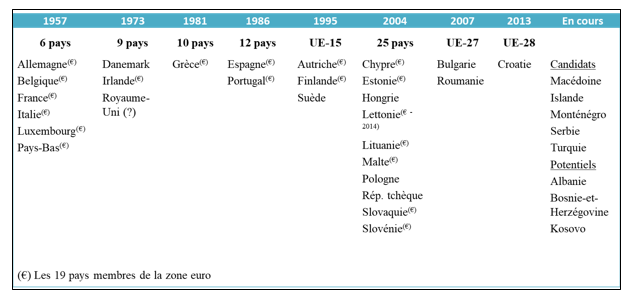 La dynamique de construction de l’UE est également fondée sur une démarche d’extension qui vise à repousser sans cesse ses frontières. Cette dynamique d’élargissement constitue un défi pour l’UE qui doit progressivement intégrer des pays aux niveaux de développements différents. En 1993, le sommet de Copenhague fixe les critères d’adhésion à l’UE : les pays doivent avoir un régime démocratique, une économie de marché et s’engager à adhérer aux acquis communautaires (règlements et directives de l’UE).