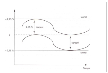 Instauration de parités fixes : les monnaies nationales peuvent fluctuer entre elles dans des marges prédéterminées autour de cours pivots bilatéraux exprimés en écus, à plus ou moins 2,25% dans les premiers temps (avec possibilité de choisir une bande plus souple de plus ou moins 6%). En 1993, les marges sont portées à plus ou moins 15%. Enfin, les interventions des banques centrales, lorsque les cours de deux monnaies s’éloignent du pivot, se doivent d’être symétriques, la monnaie qui s’apprécie s’échangeant contre la monnaie qui se déprécie.