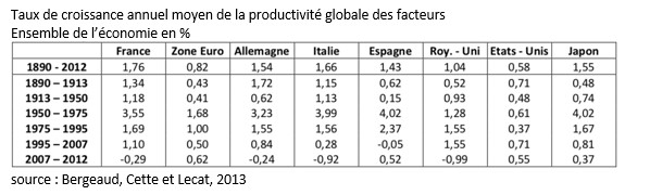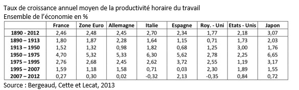 D’après l’étude menée par Gilbert Cette, Yusuf Kocoglu et Jacques Mairesse « la productivité en France, au Japon aux Etats-Unis et au Royaume Uni au cours du XXème siècle », parue dans la revue de l’OFCE en octobre 2009, on s’aperçoit que le rythme de la productivité varie dans le temps et dans l’espace. Les auteurs tirent quatre conclusions de leurs travaux :