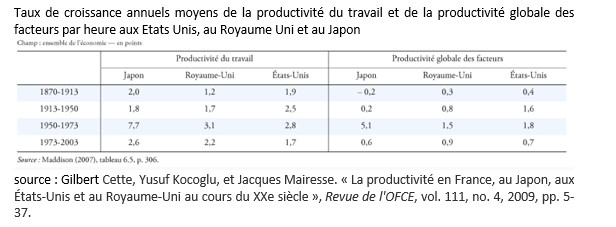La croissance des trente glorieuses a permis à la France et au Japon de connaître un rattrapage de leur niveau de productivité par rapport au niveau américain.